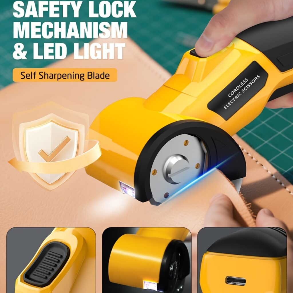 Heavy-Duty Cordless Electric Scissors with 3 Blades & 4V 2000mAh – – Rotary Cutter, Safety Lock & LED Light for Leather, Carpet, Plastic, Cardboard Cutting – Professional-Grade Fabric/Box Cutter for DIY, Workshops Cordless
